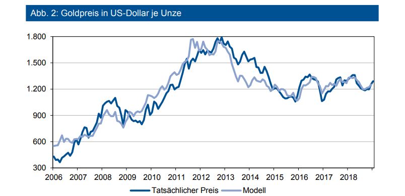 Ähnliches gilt hinsichtlich einer Überreaktion beziehungsweise eines „Herdenverhaltens“ an den Märkten infolge von Panik. Da jedoch aktuell von keiner mit 2008/09 vergleichbaren Finanzkrise auszugehen ist, spielen diese Aspekte eine untergeordnete Rolle. In Abb. 2 wird deutlich, dass der Goldpreis in jüngster Zeit kaum von der Modellschätzung abweicht: