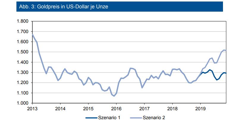 Der Goldpreis würde nur bei stark fallenden US-Renditen und einem abwertenden US-Dollar deutlich ansteigen. Diese Konstellation ist nicht völlig unplausibel, vor allem, wenn die Fed eine frühe Zinssenkung in Betracht zieht. Das Zinsdifferenzial zur Euro-Zone und anderen Ländern würde sich dann schneller einengen und den US-Dollar unter Druck setzen. Eine Eskalation der Unsicherheit wie in der Finanzkrise 2008/09 wird allerdings selbst im Falle einer konjunkturellen Eintrübung nicht erwartet. Im Szenario 2 könnte der Goldpreis um weitere 200 US-Dollar pro Feinunze ansteigen, während im Szenario 1 das Aufwertungspotenzial weitgehend ausgeschöpft ist.