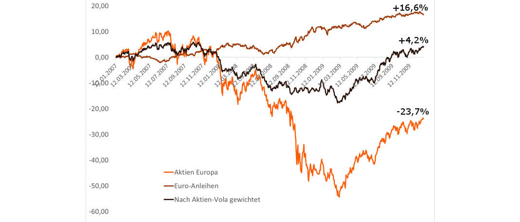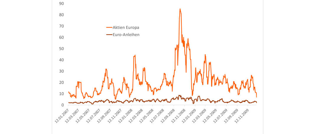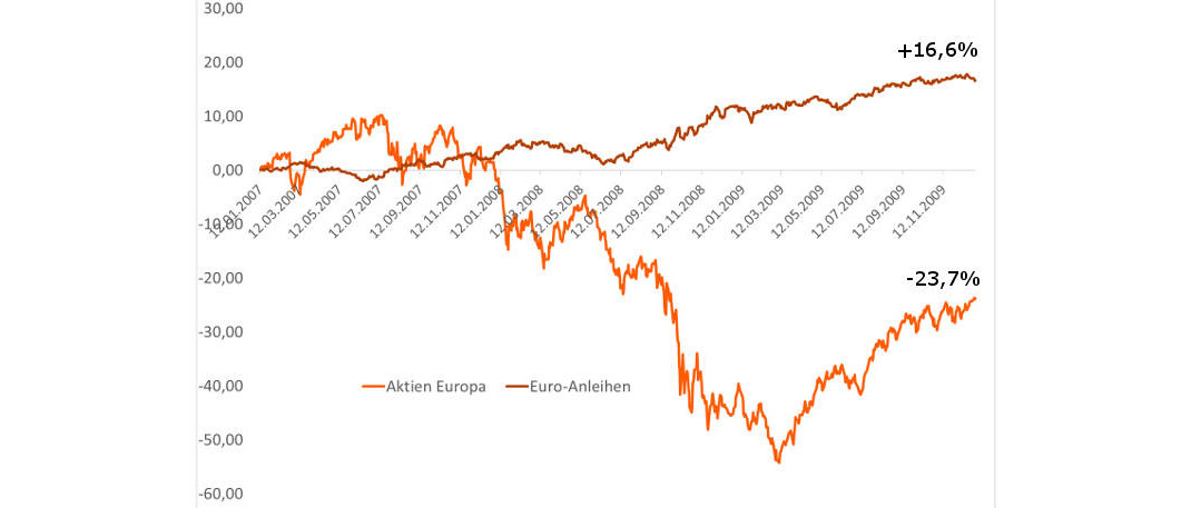 Wir erinnern uns: Im Jahr 2007 hielten sich die Aktienmärkte noch einigermaßen stabil. 2008 ging es dann los, die Kurse brachen ein. Der Crash dauerte bis März 2009, dann drehten Aktien wieder nach oben. Euro-Staatsanleihen taugten als Gegengewicht, dorthin flohen die Investoren.