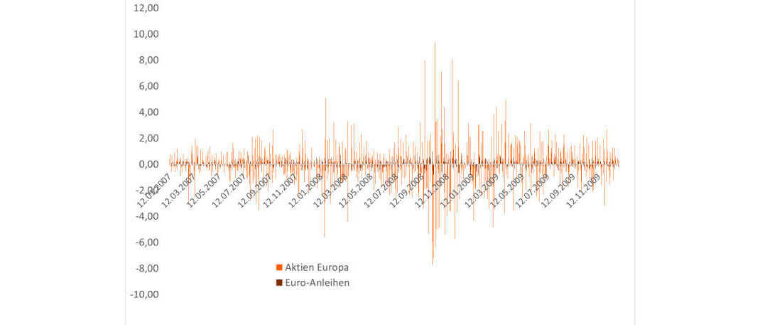 Hier sind die täglichen Renditen beider Anlageklassen abgetragen. Die mögen im Einzelnen auf dem Bild nicht sonderlich gut erkennbar sein. Allerdings ist es bestens ersichtlich, dass die Ausschläge am Aktienmarkt 2008 zum Teil furchterregendwaren.