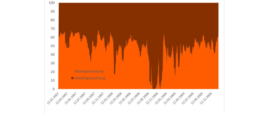Die Grafik zeigt, dass die Aktienquote in den Hochzeiten der Finanzkrise (inklusive Lehman-Pleite) sogar auf null gesunken wäre. Kein Wunder, die von uns berechnete Volatilität lag in der Zeit über 80 Prozent.