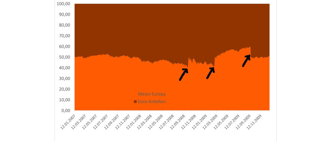 Man kann die einzelnen Punkte natürlich auch kombinieren. In dieser Studie rebalancieren wir, wenn die Aktienquote über 60 Prozent klettert oder unter 40 Prozent fällt. Dann geht es zurück auf 50 Prozent. Die Grafik zeigt, dass das 2007 bis 2009 dreimal nötig war (Pfeile).