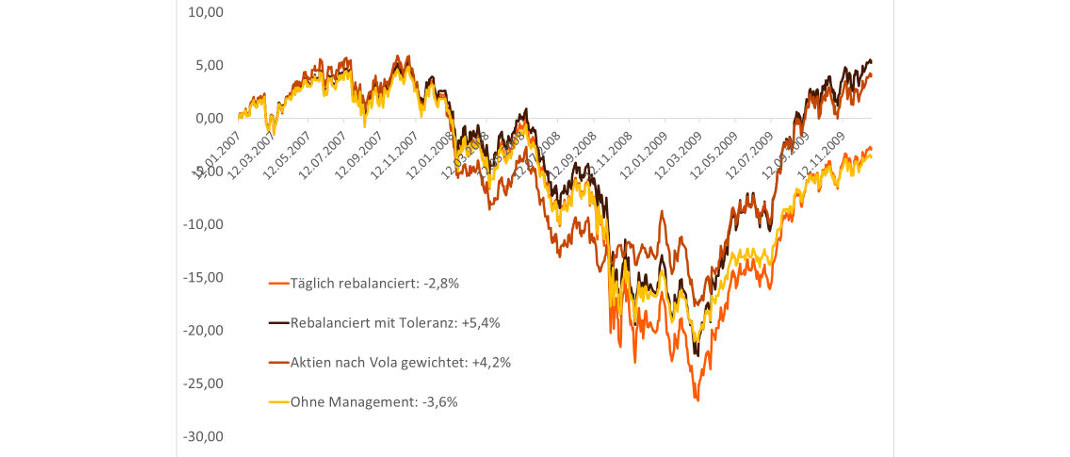 … Rebalancieren mit Toleranzschwellen. Die Strategie brachte in drei harten Jahren am Ende ein Plus von 5,4 Prozent. Tägliches Rebalancieren führt dagegen nicht zum Ziel, hier steht ein Minus von 2,8 Prozent. Abgesehen von den Kosten durch das tägliche Hin- und Hergekaufe. Es ist offenbar nicht dumm, die Anlagen ein bisschen laufen zu lassen und bei allzu großen Rissen im Gebäude einzugreifen.