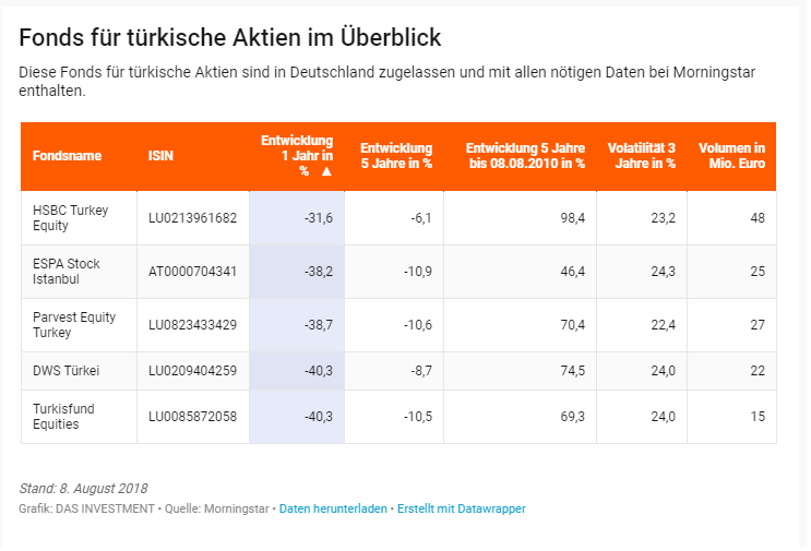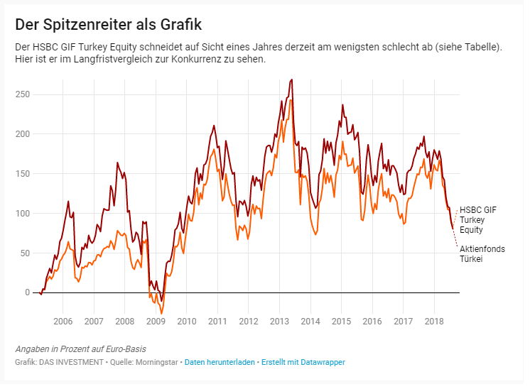 Angesichts der wirtschaftlichen Lage in der Türkei sollte es niemanden wirklich wundern, dass Türkei-Aktienfonds derzeit unter Wasser liegen. Immerhin setzt sich ein spezieller Fonds sich mit einem kleinen Detail von der Gruppe ab.Es sind nur ein paar kleine Positionen im Portfolio, die für einen enormen Unterschied in der Wertentwicklung sorgen. Denn der Fondsmanager des HSBC GIF Turkey Equity, Yigit Onat, geht auch Währungspositionen ein. Er kauft oder verkauft je nach Lage Türkische Lira gegen Euro und kann so den Kursverfall der Lira abmildern. Denn die befindet sich seit mehr als zehn Jahren mit nur kurzen Pausen im freien Fall. In der Zeit verlor sie gegenüber dem Euro fast drei Viertel ihres Werts.