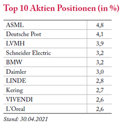 Die Länderallokation sowie Top Ten Aktien sind per 30.04.2021: