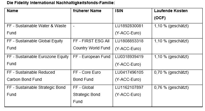 Hinweis: alle Fonds (bis auf FF – Sustainable Water & Waste Fund) waren bisher bereits unter der aufgeführten ISIN beziehbar und zum öffentlichen Vertrieb zugelassen. Für diese bestehenden Fonds ändert sich die Anlagestrategie inklusive das Anlageuniversum, Fondsname, Risikoprofil etc.