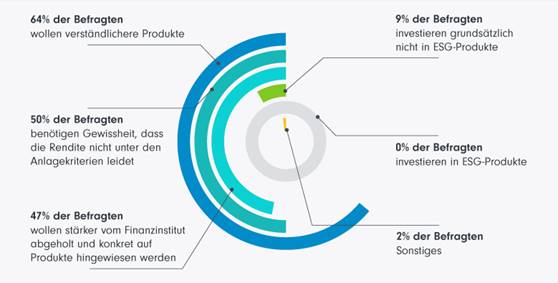 Für jeden Zweiten ist die Gewissheit wichtig, dass die Rendite nicht unter den nachhaltigen Anlagekriterien leidet. 47 Prozent fordern, ihr Finanzinstitut müsse sie stärker abholen und sie konkret auf diese Produkte hinweisen. Jeder Zehnte (9 Prozent) würde grundsätzlich nicht in ESG-Produkte investieren.