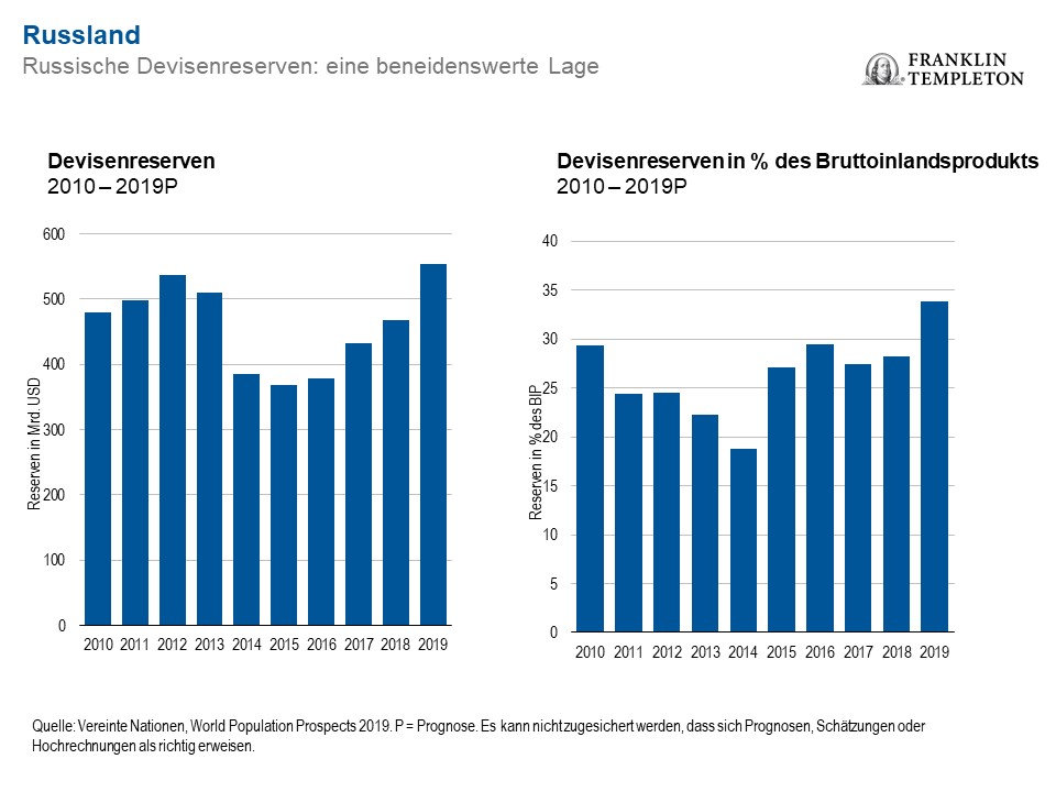 Aus unserer Sicht befindet sich Russland bei Betrachtung einiger fundamentaler Faktoren in einer beneidenswerten Lage. Es hat nur eine geringe Staatsverschuldung, einen Leistungsbilanzüberschuss und beträchtliche Devisenreserven in Höhe von 570 Milliarden US-Dollar. Dies entspricht 33 % seines Bruttoinlandsprodukts (BIP).[1]
