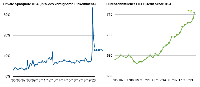 Die US-Wirtschaft erweist sich als bemerkenswert resilient und zeigt, dass sie nach wie vor die Ausdauer hat, um die COVID-bedingte Rezession hinter sich zu lassen. Mit der Lockerung der Kontaktbeschränkungen durch die Bundesstaaten erholten sich die Verbraucherausgaben und sorgten für eine V-förmige Erholung bei Bruttoinlandsprodukt (BIP) und Beschäftigung. Die fiskalische und geldpolitische Unterstützung war unverzichtbar, und es werden weitere Beihilfen ausgezahlt: Die private Sparquote bleibt mit fast 15 % hoch, und die Haushalte haben ihre Kreditwürdigkeit mit einer durchschnittlichen Bonität, die so hoch ist wie noch nie seit Beginn der Erfassung 2005, verbessert und horten Reserven für künftige Ausgaben.1