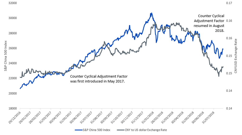 Als der antizyklische Faktor im Mai 2017 erstmals eingeführt wurde, war der CNY mit rund 6,9 gegenüber dem US-Dollar ebenfalls schwach. Der Faktor dämmte den Abwertungstrend ein und es folgte eine anhaltende Aufwertung des CNY gegenüber einem Währungskorb. Auch der S&P China 500 Index tendierte aufwärts (siehe Abbildung 1). Im Januar 2018 wurde die Anwendung dieses Faktors ausgesetzt, da der Abwertungsdruck sich verflüchtigte.