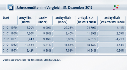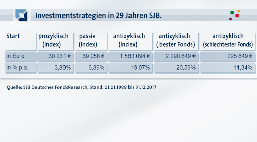 Die besten Fonds in den schlechtesten Märkten. Diese einfache SJB Erfolgsformel bringt die Ergebnisse der Antizyklikstudie auf den Punkt. Wie die Tabelle unten zeigt, sind die durchschnittlichen Ergebnisse über 29 Jahre SJB für den Investor hervorragend: Vom 1. Januar 1989 bis zum 31. Dezember 2017 erzielte der antizyklische Investor mit den besten Fonds in den schlechtesten Märkten im Durchschnitt Jahr für Jahr eine Rendite von 20,59 Prozent p.a. in Euro. Verglichen mit der passiven Buy-and-Hold-Strategie sind das pro Jahr 13,70 Prozentpunkte mehr und verglichen mit der prozyklischen Herdentrieb-Strategie sogar 16,70 Prozentpunkte mehr.