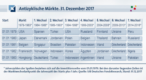 Der schwächere Jahrgang ab 1. Januar 1981 ist ein Beispiel dafür, dass die Antizyklik-Strategie nie als ein einziges Investment zu verstehen ist. Nach einem sehr guten Start begann mit dem fünften Marktwechsel 2004 von Indonesien zu Irland das schwächere Abschneiden. Im ersten Teil des Fünf-Jahres-Zeitraums bis 31. Dezember 2008 profitierten die Investoren vom Aufschwung des „keltischen Tigers“, vor allem wegen des Finanz- und Immobiliensektors. Aus den gleichen Gründen fiel der Markt in der Subprime-Krise und nach der Lehman Pleite ab Mitte 2007 wieder signifikant zurück. Der folgende Marktwechsel 2009 von Irland nach Griechenland brachte keine durchgreifende Besserung, da mit Hellas das nächste von Euro- und Schuldenkrise gebeutelte Land zum Investmentziel wurde, dem trotz zwischenzeitlich positiver Ansätze in dem fünfjährigen Anlagezeitraum keine Trendwende gelang. Durch die Besonderheit, dass Griechenland im Jahre 2016 erneut zum antizyklischen Markt „gekürt“ wurde, liegt das Vermögen dieser Investment-Zeitreihe weiterhin an der Börse von Athen – mit bislang nur unterdurchschnittlichen Ergebnissen (Jahresrendite +3,88 Prozent). Die Konsequenz für antizyklische Investoren: Sie sollten immer in mehreren antizyklischen Märkten gleichzeitig investiert sein und mehrere Antizyklik-Strategien mit unterschiedlichen Startpunkten parallel verfolgen.