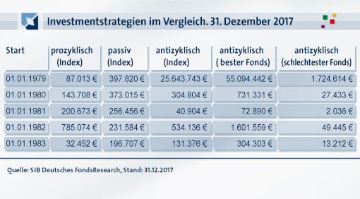 Seit 29 Jahren verfolgt die SJB FondsSkyline 1989 e.K. mit aller Konsequenz ihren antizyklischen Investmentansatz, der sich als langfristig überaus erfolgreich erwiesen hat. In der aktuellen Börsenphase, in der sich nach einer über neunjährigen Hausse an den großen internationalen Aktienmärkten ein hohes Korrekturpotenzial aufgestaut hat, ist diese Strategie aktueller denn je. Denn wie die nun aktualisierte Antizyklikstudie für 2018 beweist, gibt es im Umfeld zunehmender Kursschwankungen eine bemerkenswerte Konstante: Antizyklik ist nachweislich die erfolgreichste Investmentstrategie. Das bestätigt der unabhängige Vergleich zwischen drei Investoren, die unterschiedlichen Anlagestrategien folgen: einer passiven, prozyklischen und antizyklischen Strategie. Durchgeführt und fortgeschrieben wird die Langzeituntersuchung auf der Basis historischer Kursdaten von der SJB Deutsches FondsResearch.