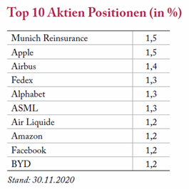 Per 30.11.2020 lag die Aktienquote bei 76,75%. Wir achten bei der Zusammensetzung weiter auf eine breite Streuung und Diversifizierung, was in den jeweiligen Quoten der Top Ten Aktien mit jeweils um die 1,5% Gewichtung zum Ausdruck kommt. Ebenso sind wir hinsichtlich der Regionen breit gestreut.