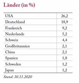Per 30.11.2020 lag die Aktienquote bei 76,75%. Wir achten bei der Zusammensetzung weiter auf eine breite Streuung und Diversifizierung, was in den jeweiligen Quoten der Top Ten Aktien mit jeweils um die 1,5% Gewichtung zum Ausdruck kommt. Ebenso sind wir hinsichtlich der Regionen breit gestreut.